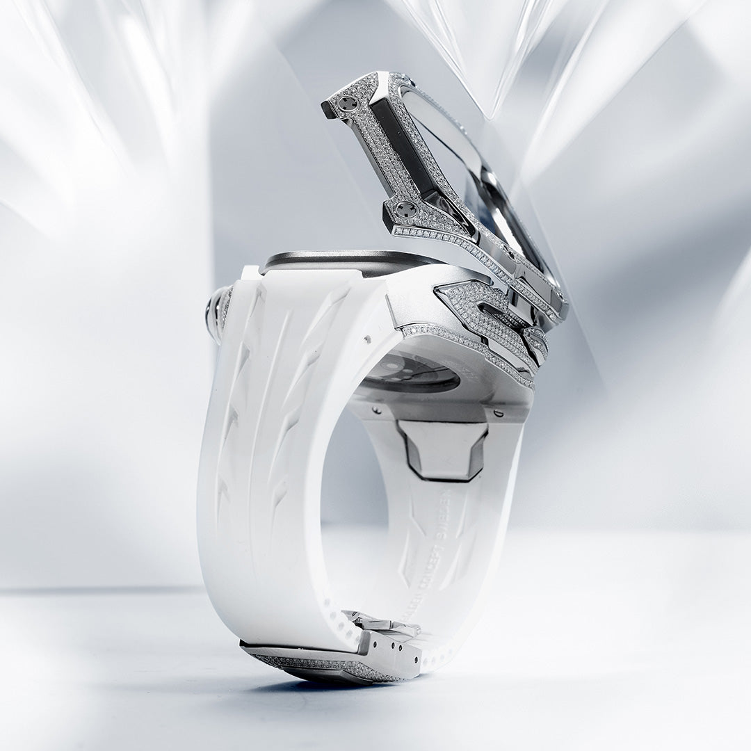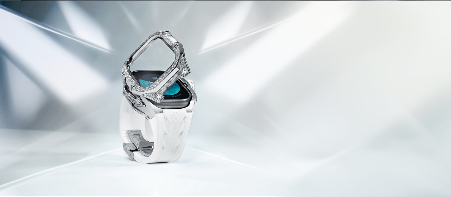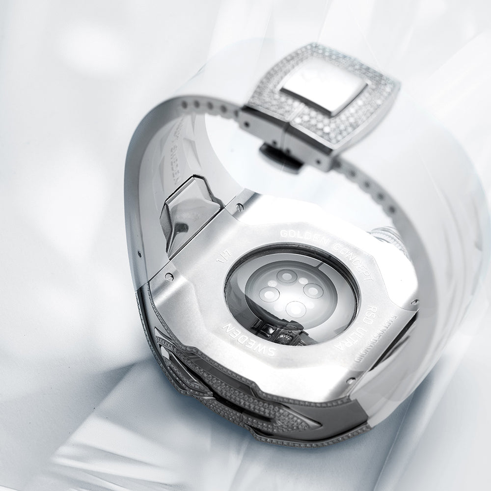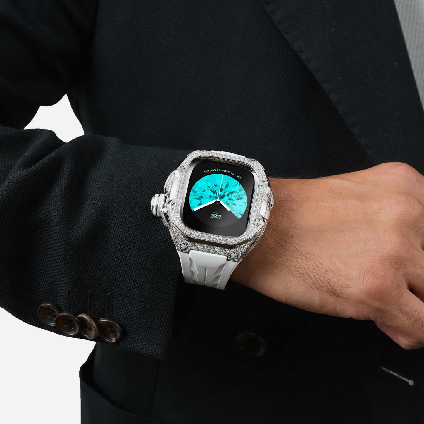 Elevate your style to the highest levels with our diamond-encrusted Apple Watch case. Adorned 1,068 handset diamonds, this luxurious accessory transforms your watch into a statement of opulence and sophistication, ensuring that every glance is met with unparalleled brilliance.