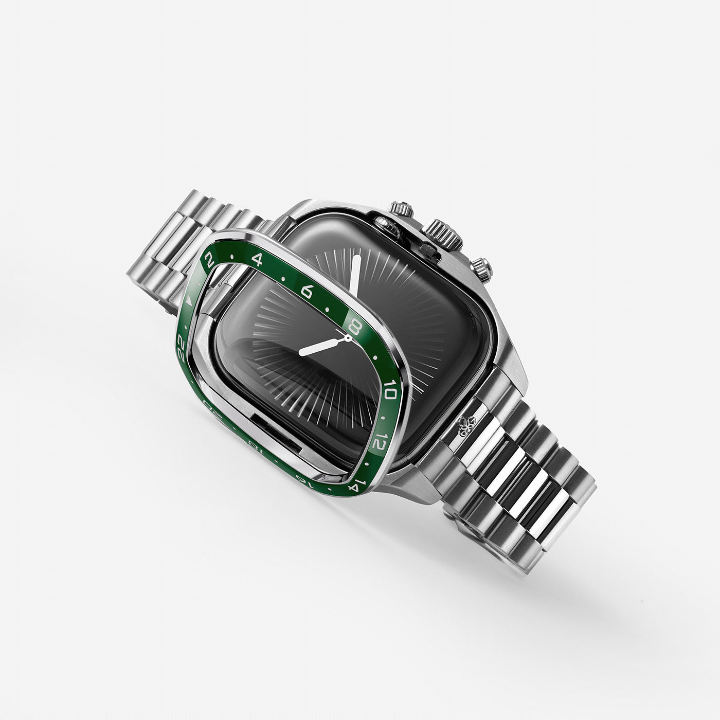 The bezel, crafted from premium ceramic, boasts a sleek, polished finish in a deep, rich green that commands attention. Skilled artisans meticulously engrave and hand-paint each detail, ensuring every piece is truly unique. The result is a piece that feels reminiscent of traditional watchmaking, reimagined for the Apple Watch.
