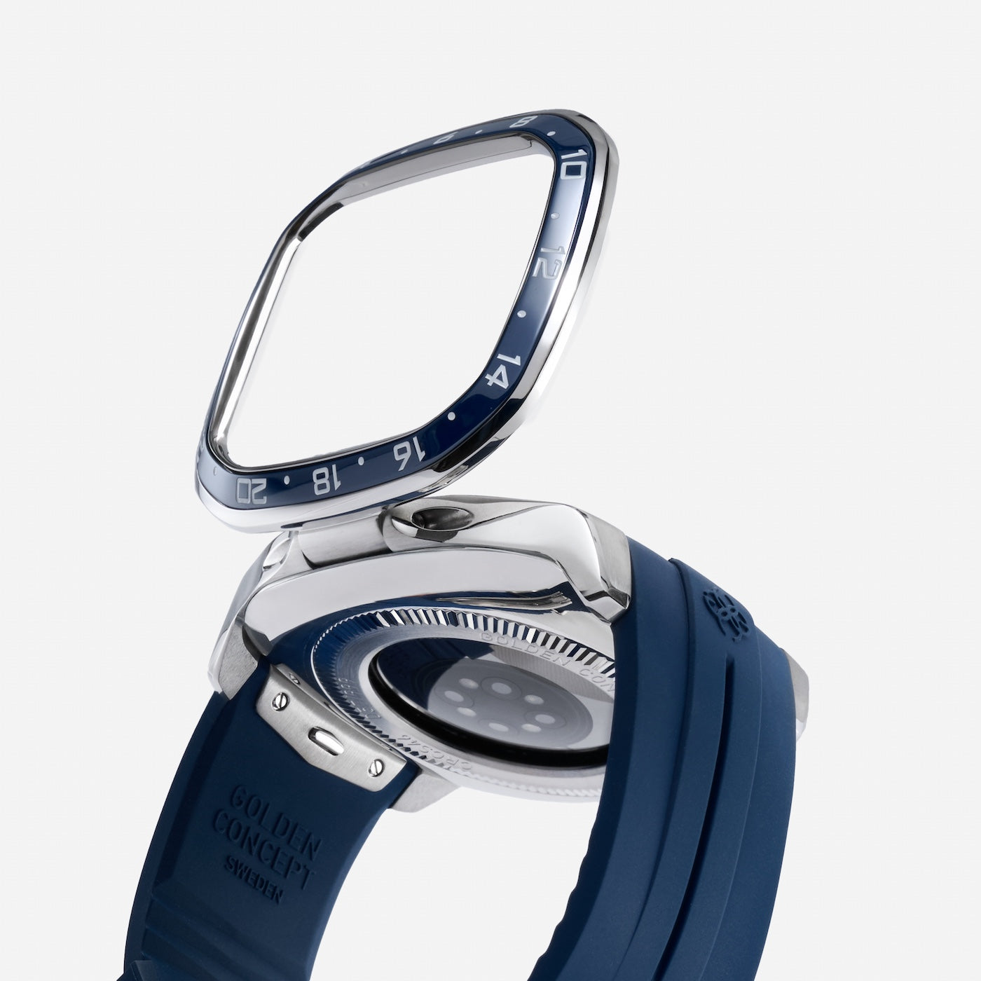 The bezel, crafted from premium ceramic, is finished in a polished, deep blue that conveys sophistication without being overstated. Each detail is carefully executed by skilled artisans, blending inspiration from traditional watchmaking with a modern case designed for the Apple Watch.