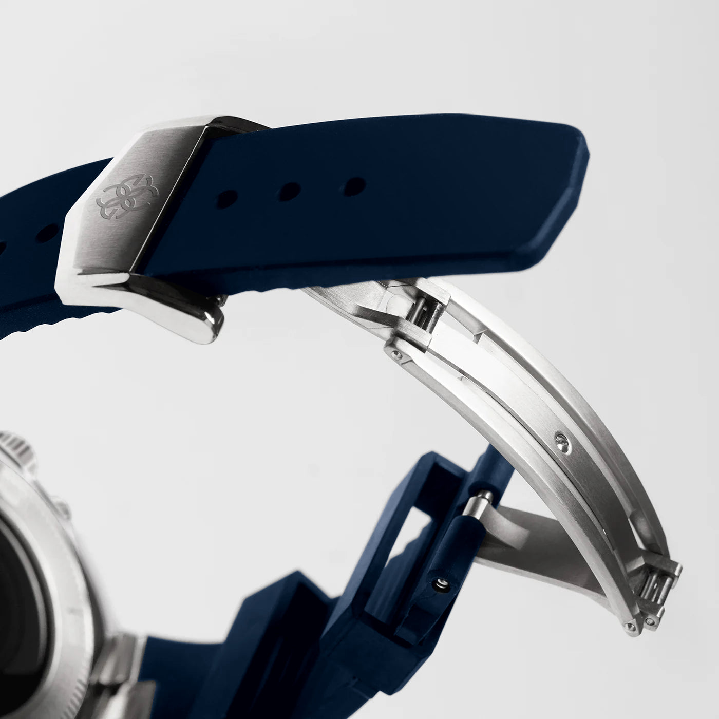 The Crown Sport Edition is fitted with our blue Crown Rubber strap in high-performance fluoroelastomer, paired with a sleek butterfly clasp. Flexible, water-resistant, and durable, it offers lasting comfort with a smooth and reliable fit.