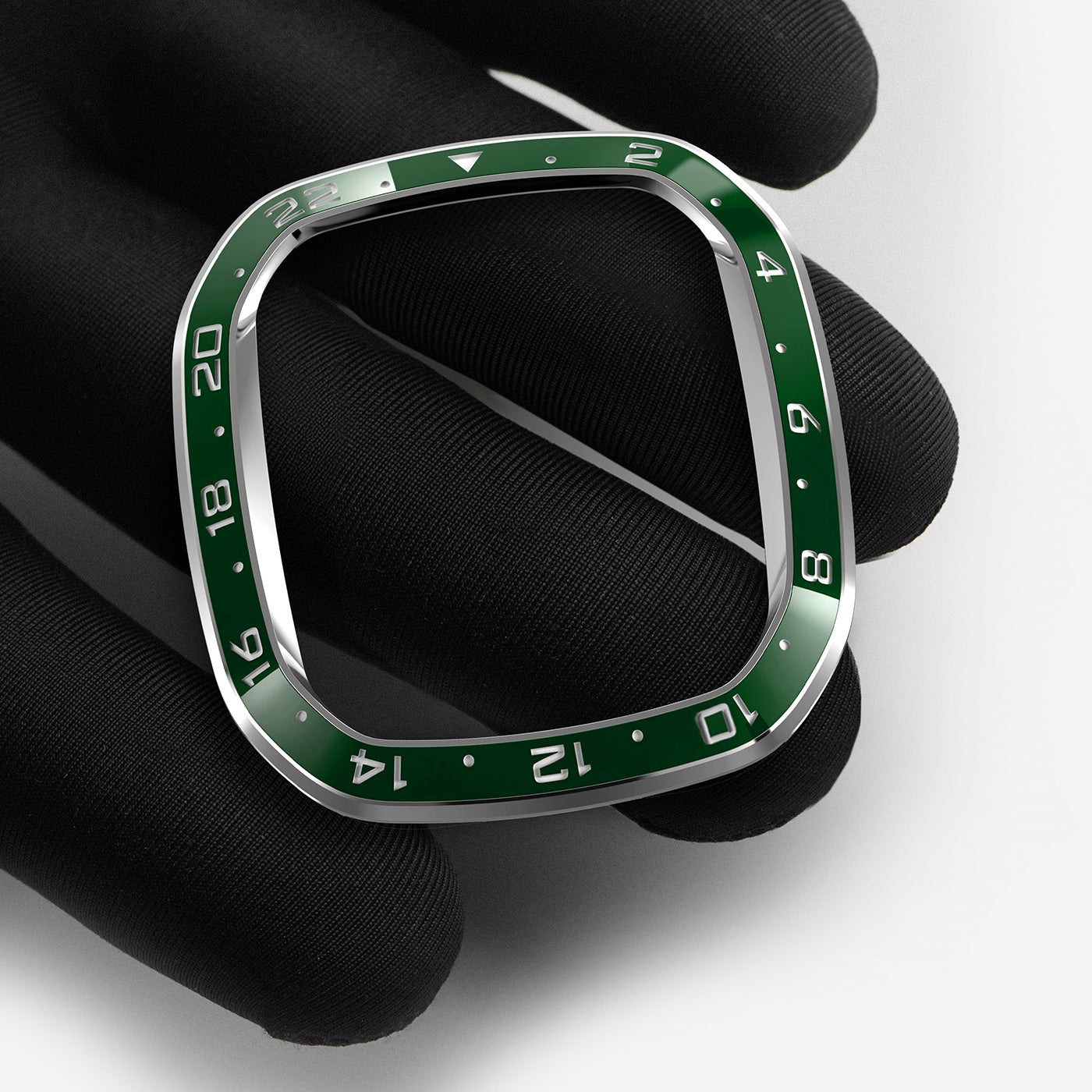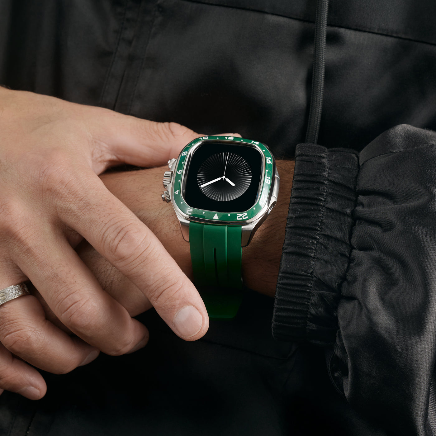 The bezel, crafted from premium ceramic, boasts a sleek, polished finish in a deep, rich green that commands attention. Skilled artisans meticulously engrave and hand-paint each detail, ensuring every piece is truly unique. The result is a piece that feels reminiscent of traditional watchmaking, reimagined for the Apple Watch.