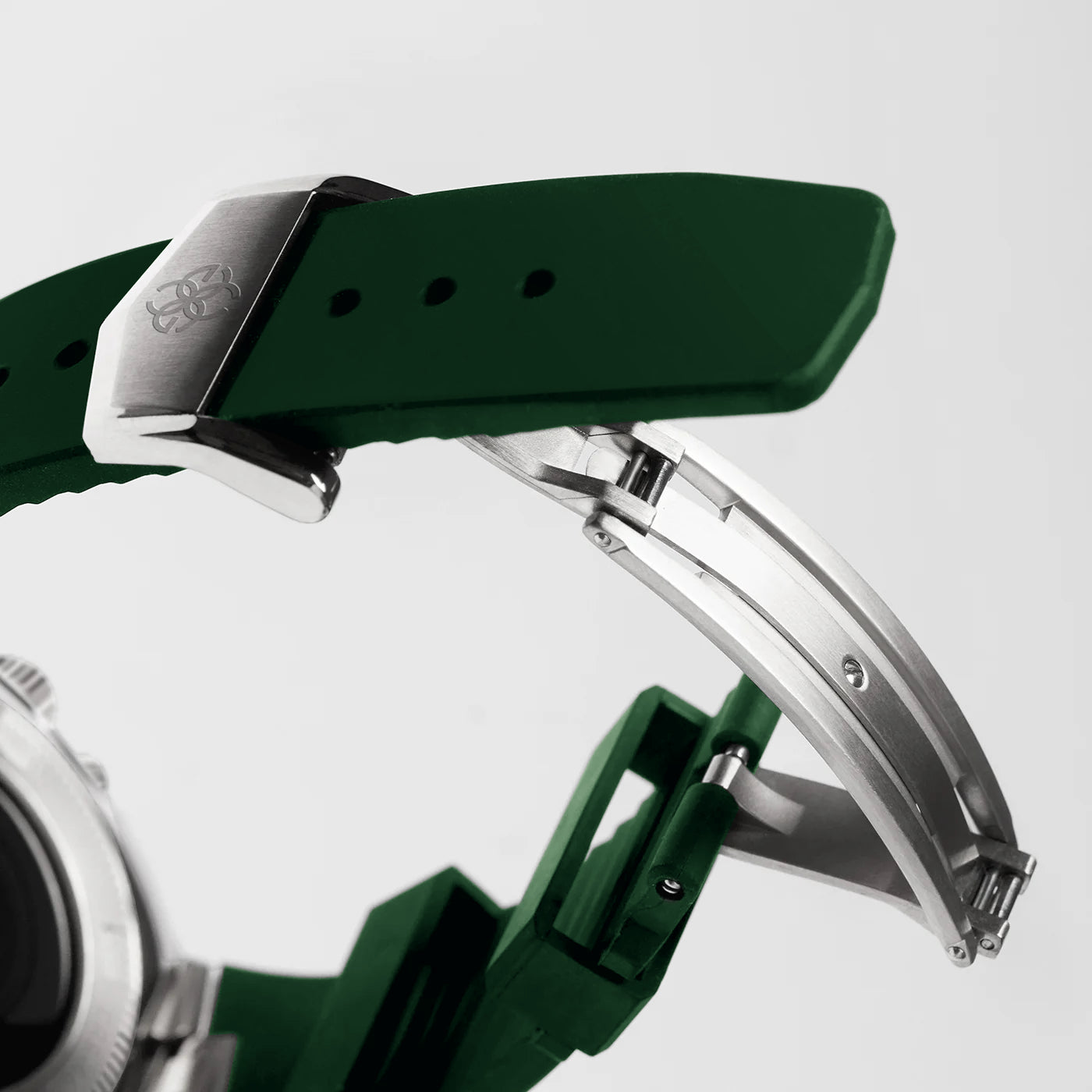 The Crown Sport Edition is fitted with our Crown Rubber strap in high-performance fluoroelastomer, paired with a sleek butterfly clasp. Flexible, water-resistant, and durable, it offers all-day comfort with a smooth and reliable fit.