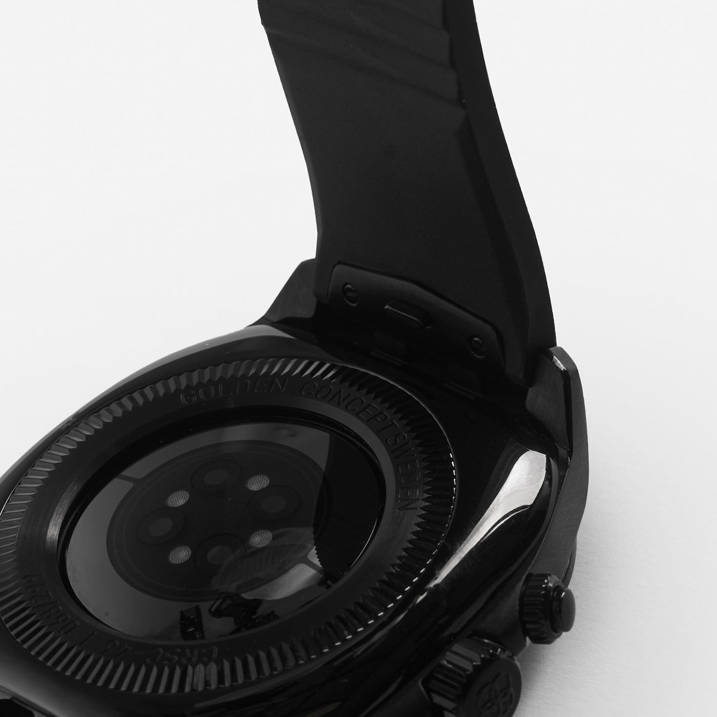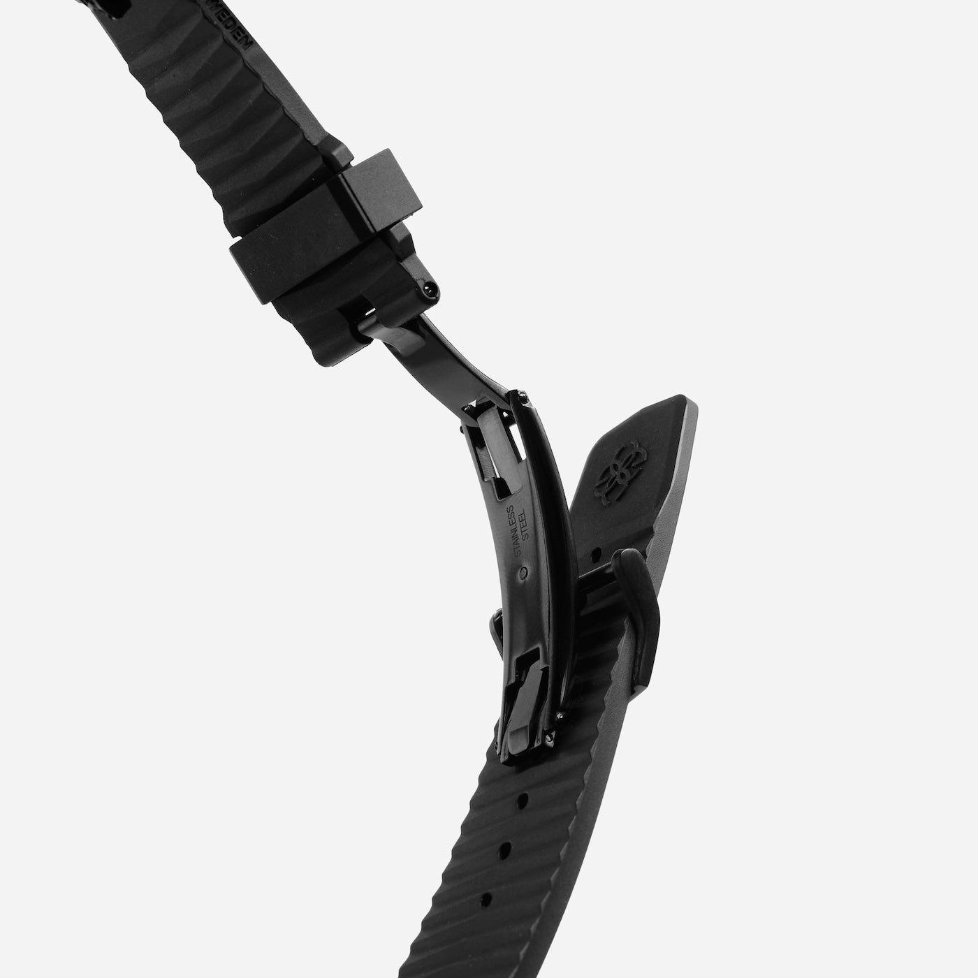 The bezel is crafted in Carbon Composite, a material that combines strength with lightness. The case is finished in black PVD, giving it depth and durability, while subtle white accents on the tachymeter scale add a distinctive touch.