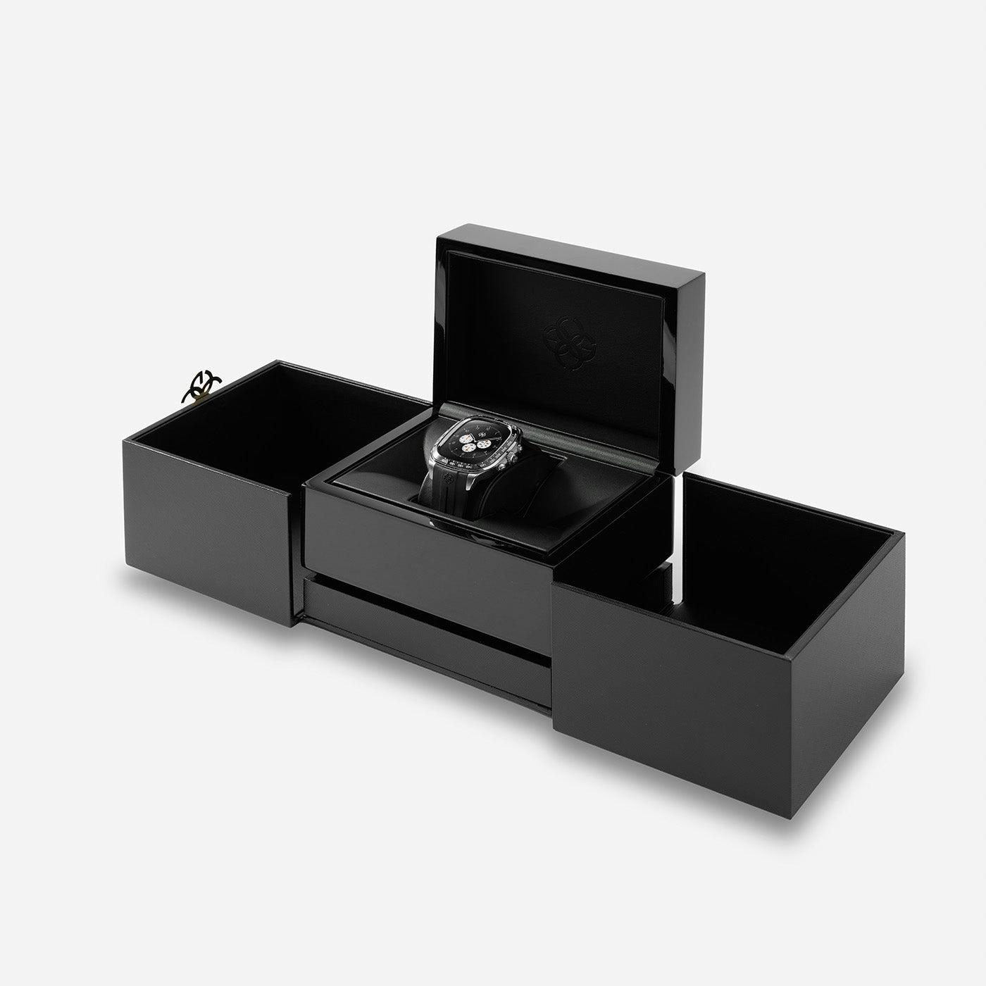 Each Crown Sport Edition is presented in a box as exceptional as its contents. Meticulously handcrafted, it boasts elegant black wood and a leather interior. This exquisite case is not just packaging, but a testament to our commitment to excellence, making the unveiling of your Crown Sport an experience in itself.
