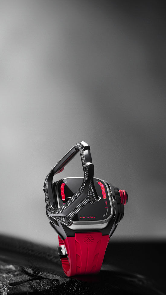 Designed for connoisseurs of detail, the Racing Sport Edition Diablo enhances your Apple Watch Ultra with black moissanite gems. Born in space, these gems have a unique black hue that distinguishes each case. Black Moissanites offer a deep, intriguing charm unlike traditional diamonds, enriching your device's allure.