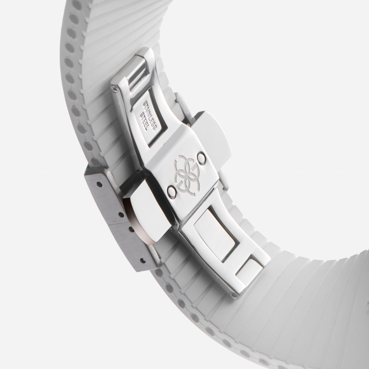 The Snowflake timepiece highlights a silver butterfly buckle, gracefully complementing its sleek design. Paired with a pristine white strap, this ensemble exudes a captivating aesthetic, distinguishing the Snowflake as an emblem of refined elegance and sophistication.
