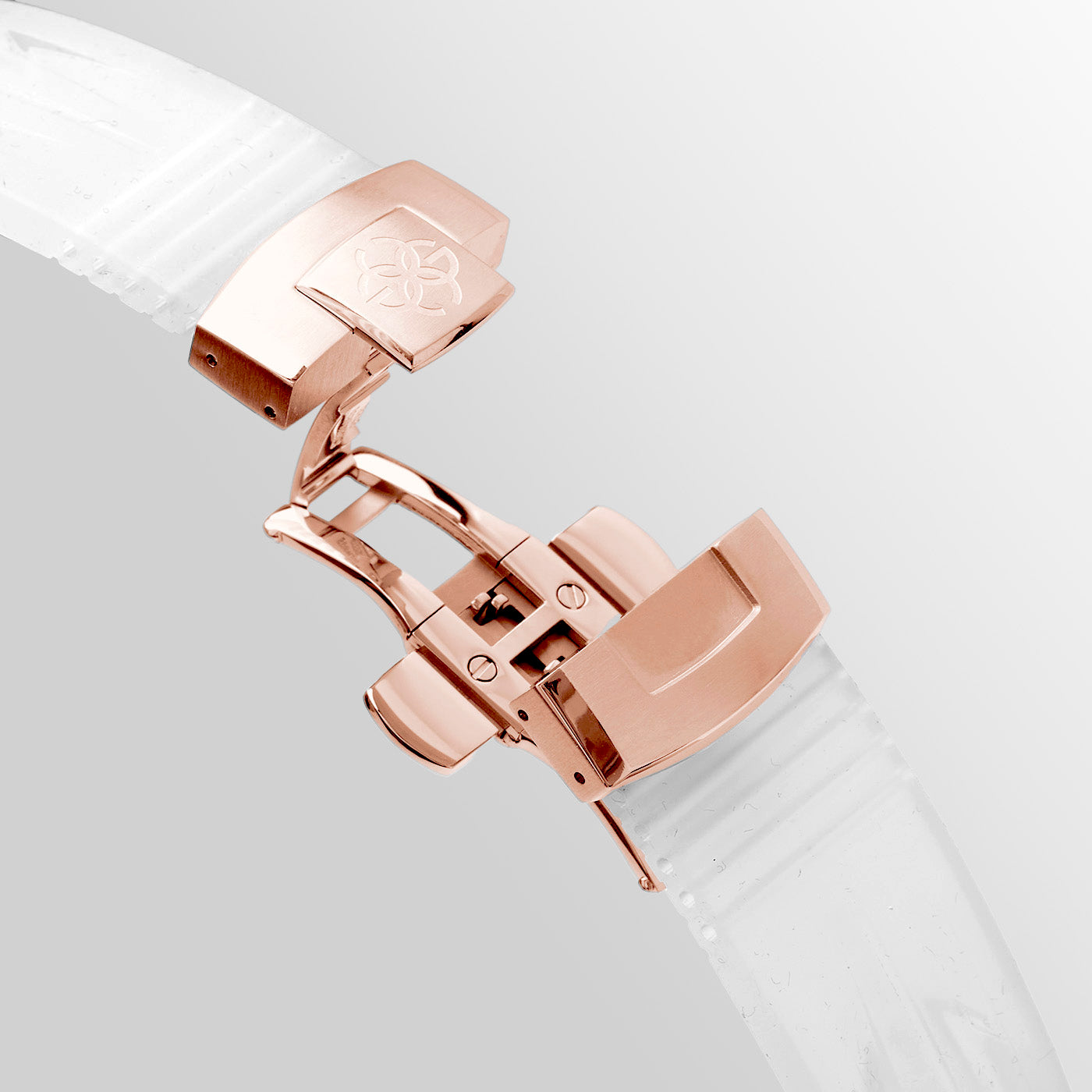 The high-density translucent silicone strap offers both comfort and sophistication. Lightweight and flexible, it moves effortlessly with you, while the stainless steel butterfly clasp adds a touch of elegance. With our click-on mechanism, changing straps is seamless—allowing you to tailor your watch to every moment.