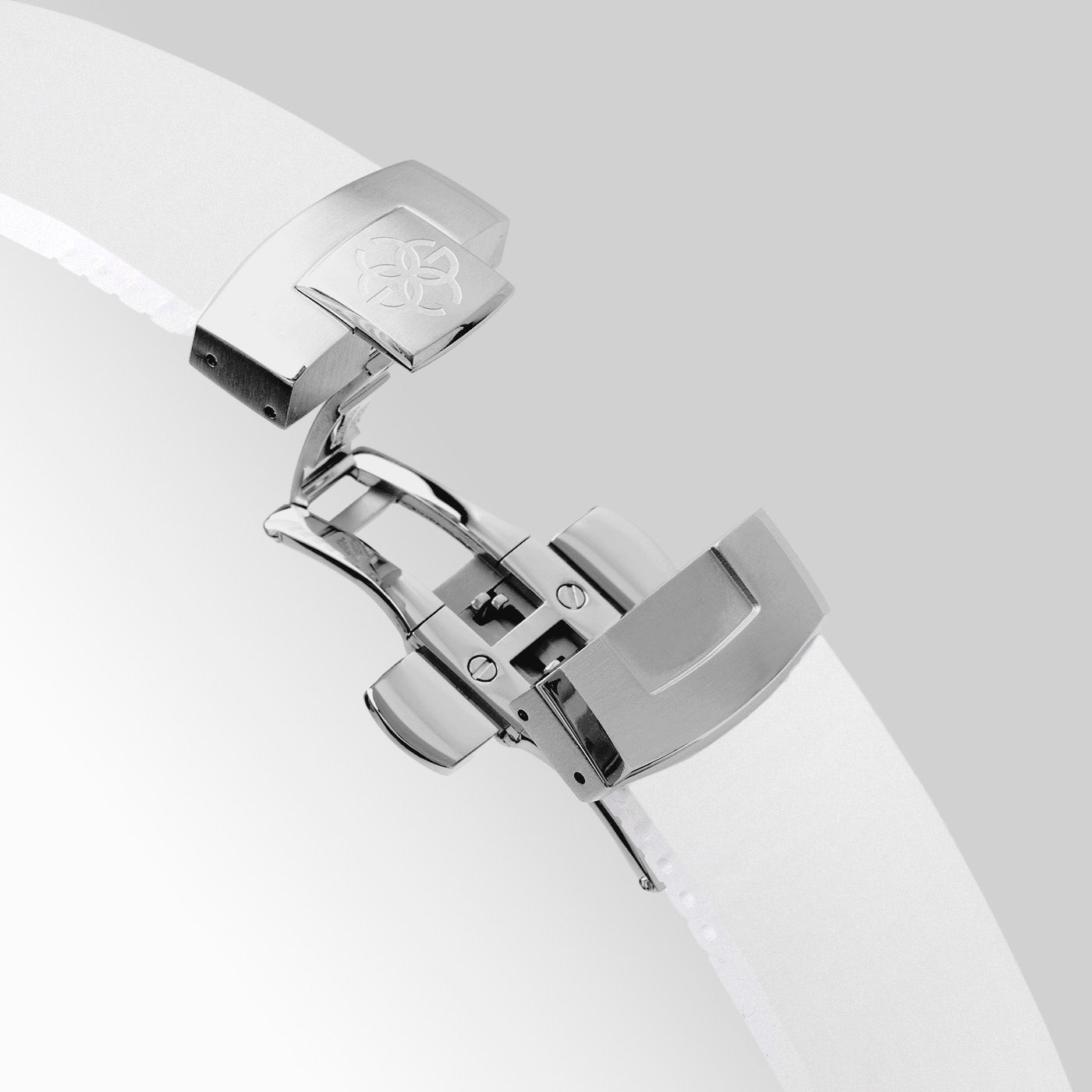 The white fluoroelastomer strap combines durability and style. Its lightweight and flexible design ensures comfort, while the stainless steel butterfly clasp adds a refined touch. With our click-on mechanism, changing straps is effortless—allowing you to customize your watch for any occasion.