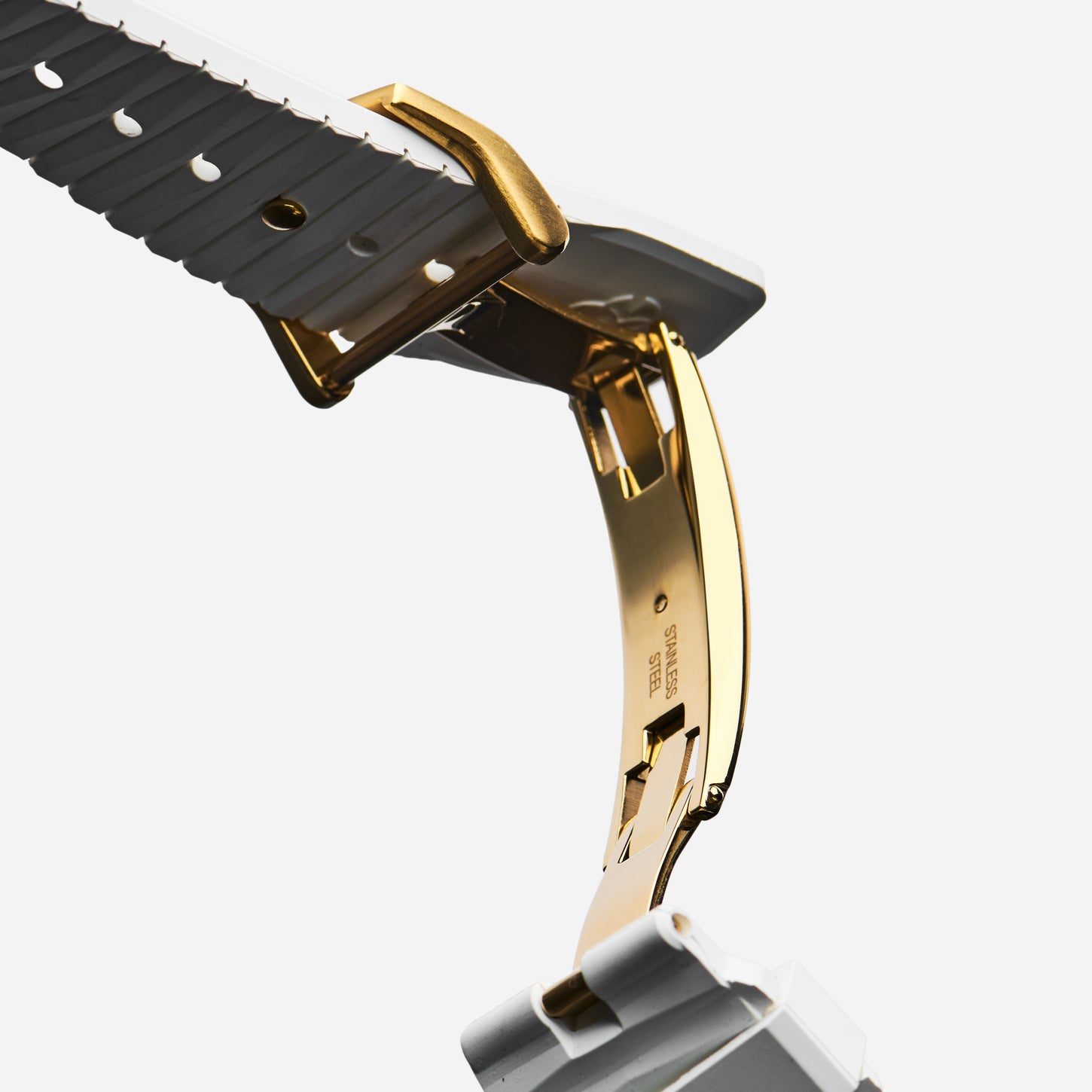 Our latest strap innovation is all about simplicity and durability. Made from top-grade fluoroelastomer for lasting comfort and equipped with a sturdy stainless steel mechanism, it's designed for quick and effortless attachment. Snap it on or off seamlessly, ideal for the active and practical user.