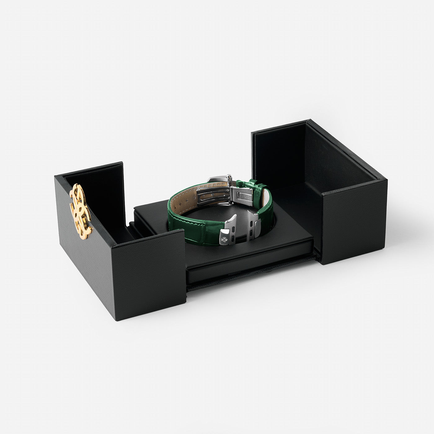 Each Apple Watch strap is presented in packaging that reflects its quality and craftsmanship. Thoughtfully designed, the box features a refined black leather interior that enhances the sense of luxury. This is more than just packaging; it’s a testament to our commitment to excellence, turning the unboxing of your strap into an experience.