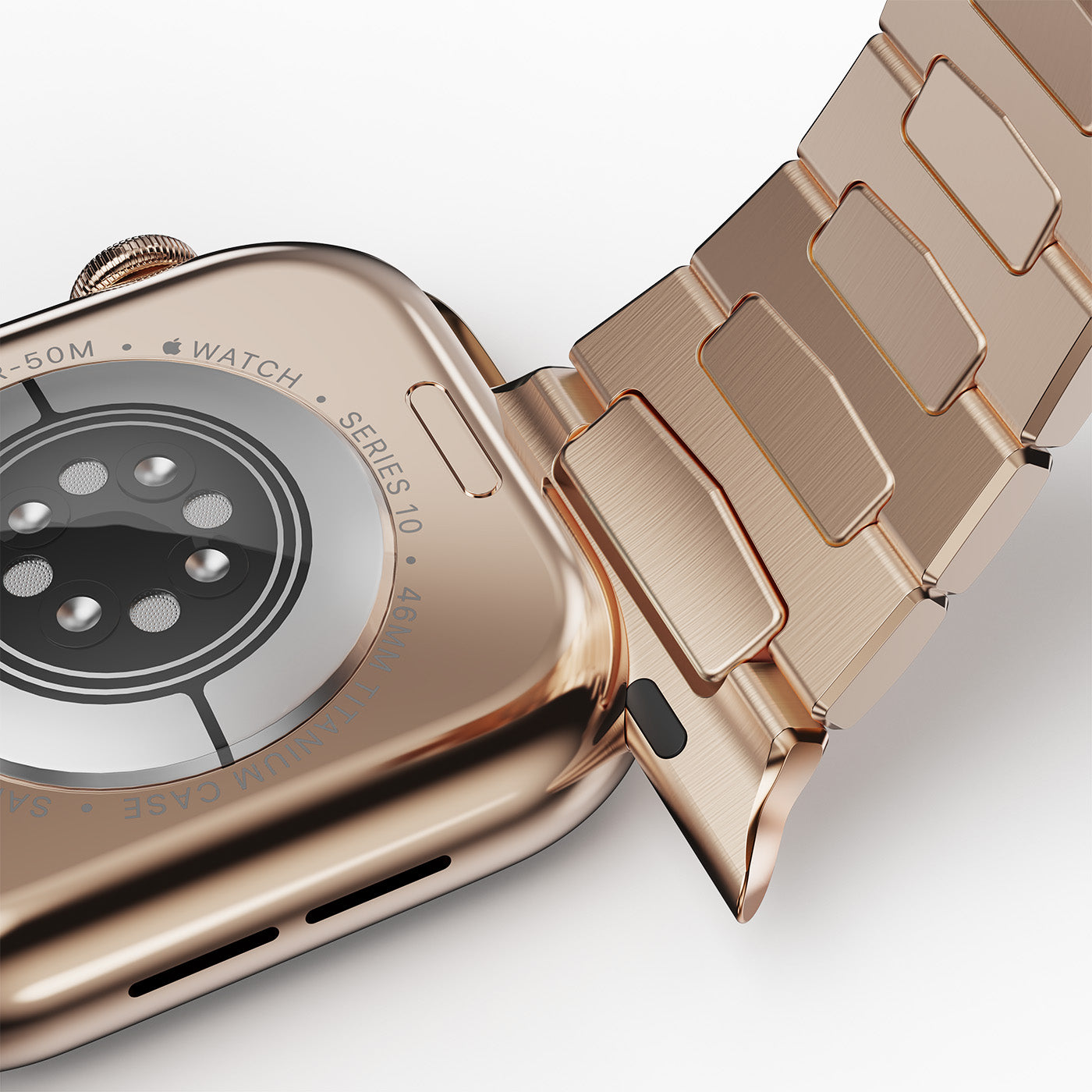 Introducing the next generation of our Royal Apple Watch strap, featuring a revolutionary resizing system. Instead of removing pins and links, this updated model allows you to effortlessly click the links on and off, offering a quick, customizable fit.
