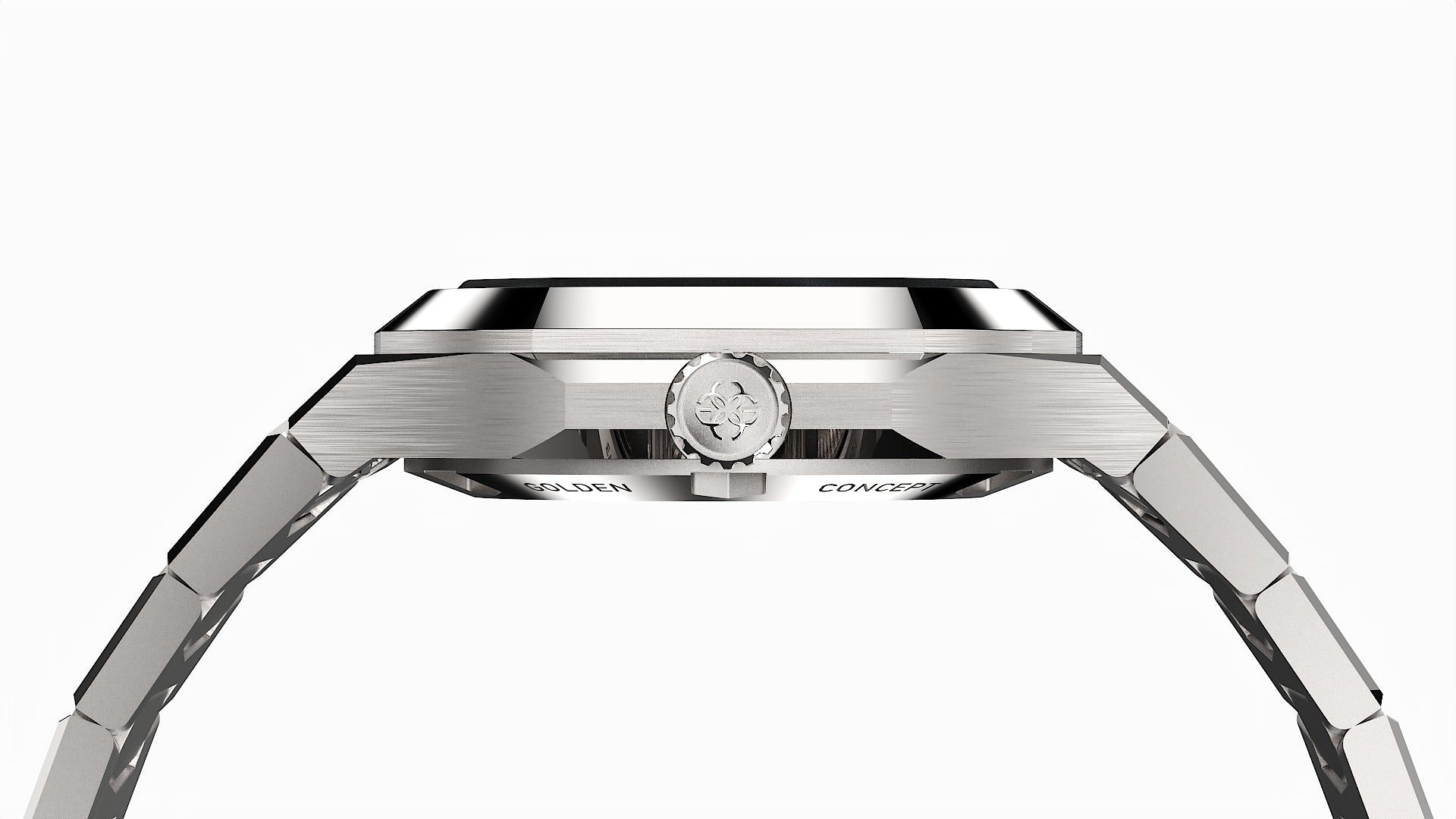 The GC FlexLink bracelet features a sculpted two link design with brushed outer surfaces and polished 904L center segments. Its tool free click release system allows links to be removed with ease for a precise fit. The watch also includes the GC Click In system, enabling simple transitions between the bracelet and the GC MotionBand.