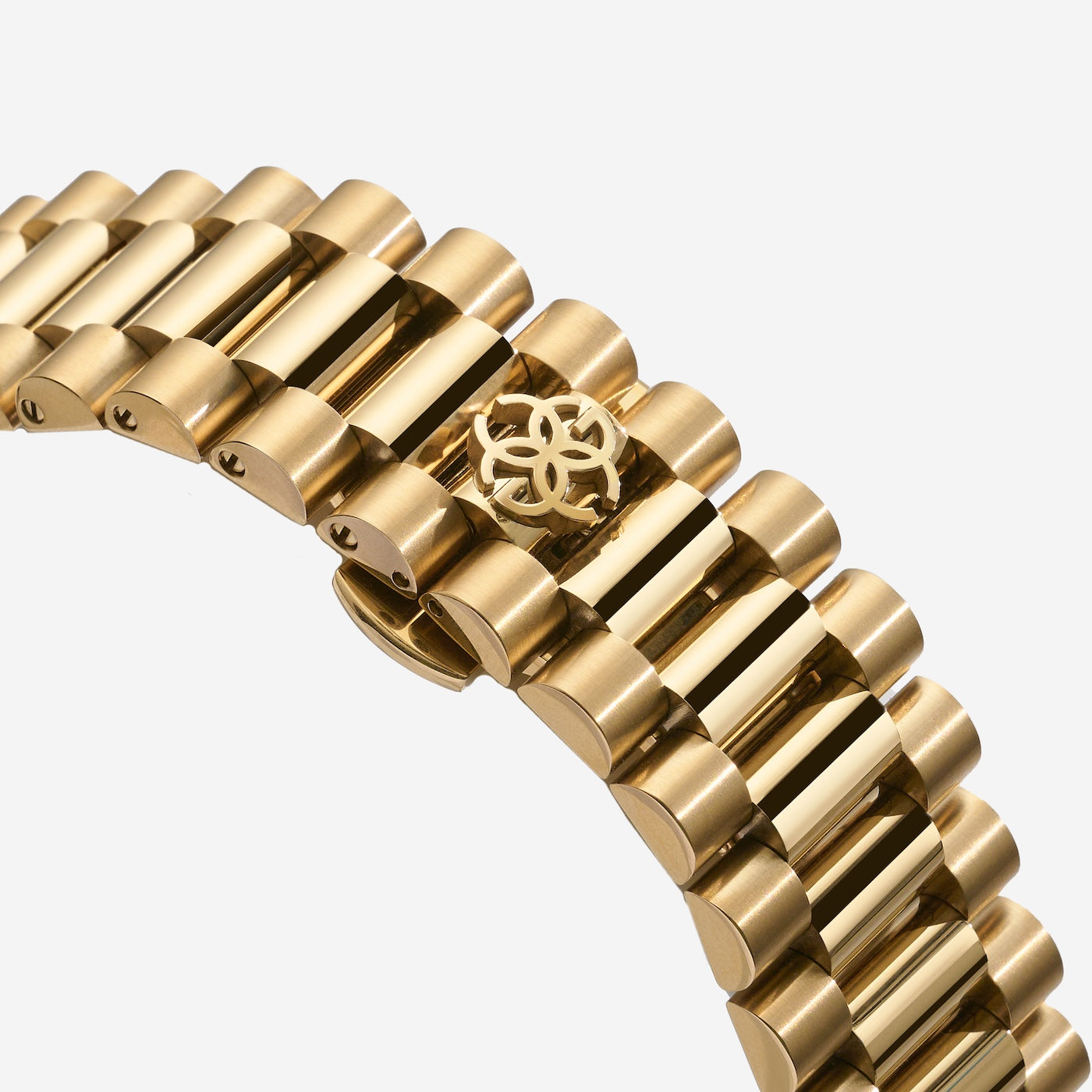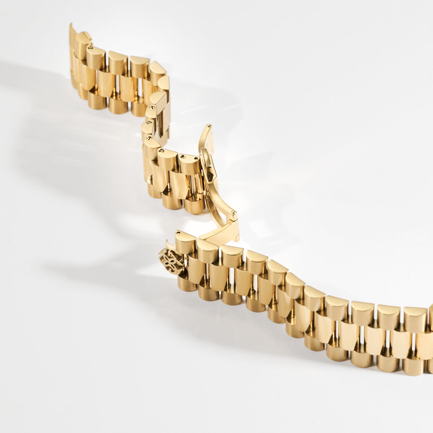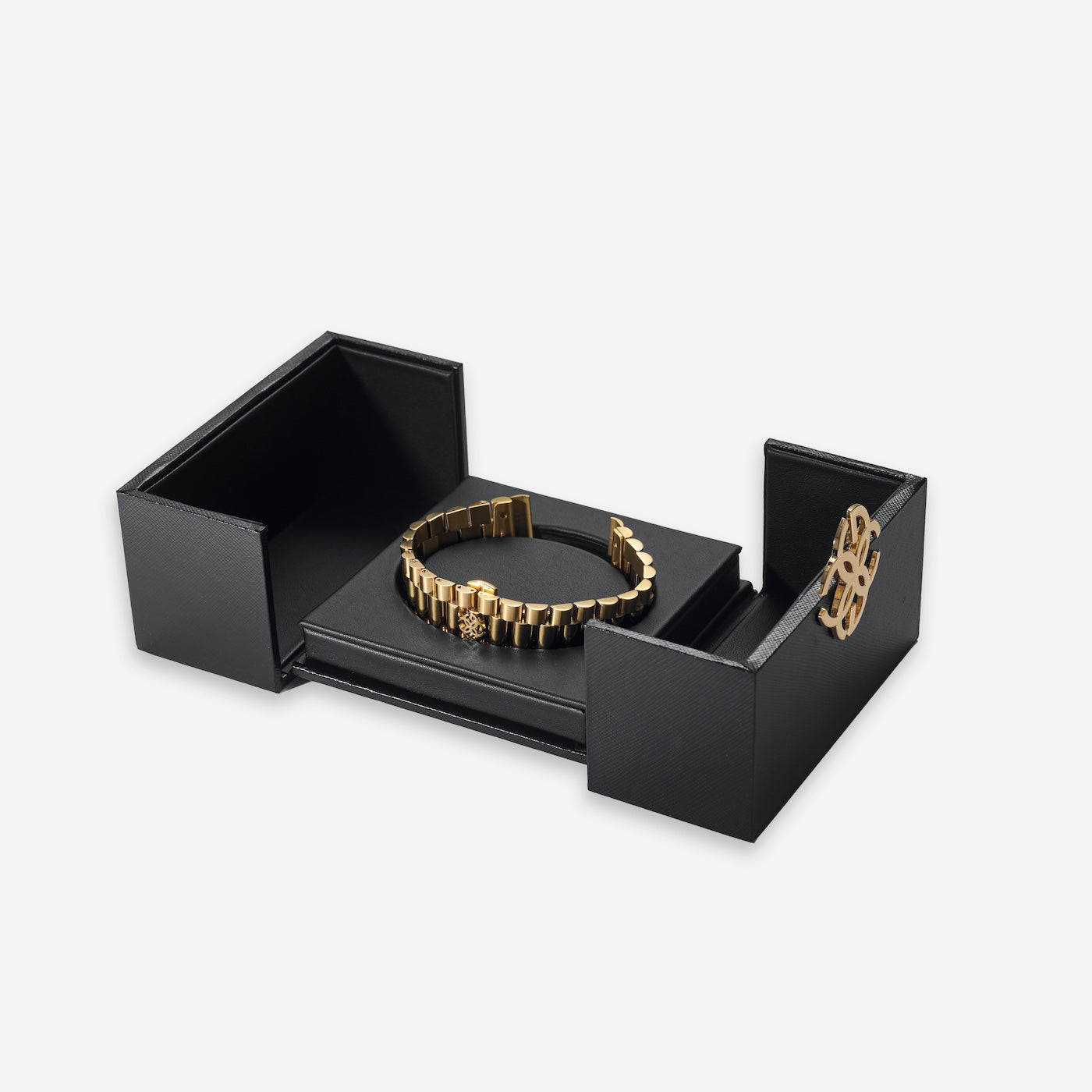 The butterfly clasp is engineered for a secure and balanced fit, closing in two smooth, symmetrical folds. Discreetly integrated into the design, the central link itself forms the clasp, marked with a raised GC emblem. This hidden mechanism preserves the bracelet’s uninterrupted lines while adding a subtle mark of distinction.