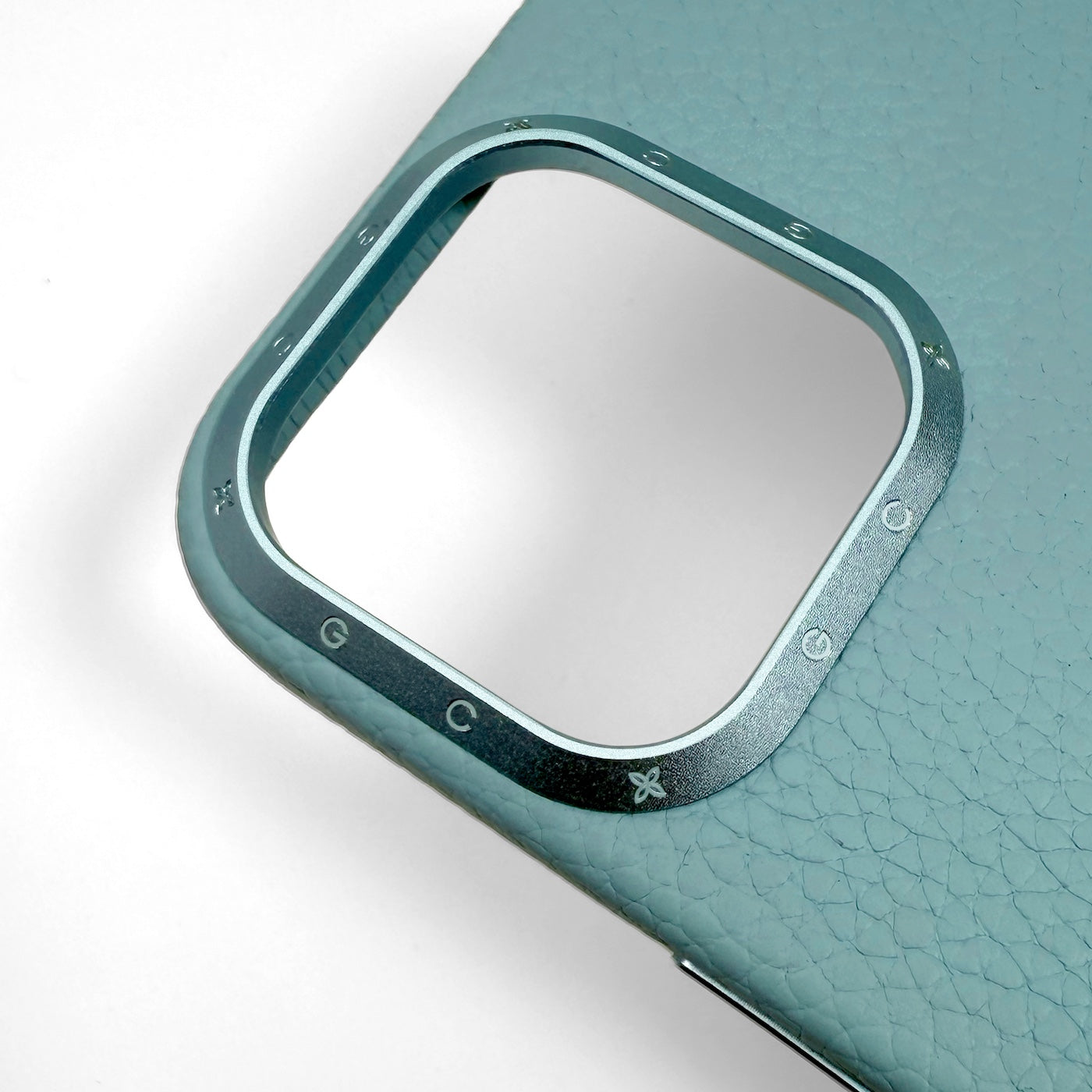 At the heart of the design is an aluminium frame that surrounds the camera and features an engraved GC monogram. The frame is anodized — a process that bonds color to the metal for durability, scratch resistance, and a finish that won’t fade. Though matte, it catches the light with a vibrant yet soft reflection, creating an elegant contrast with the textured leather.