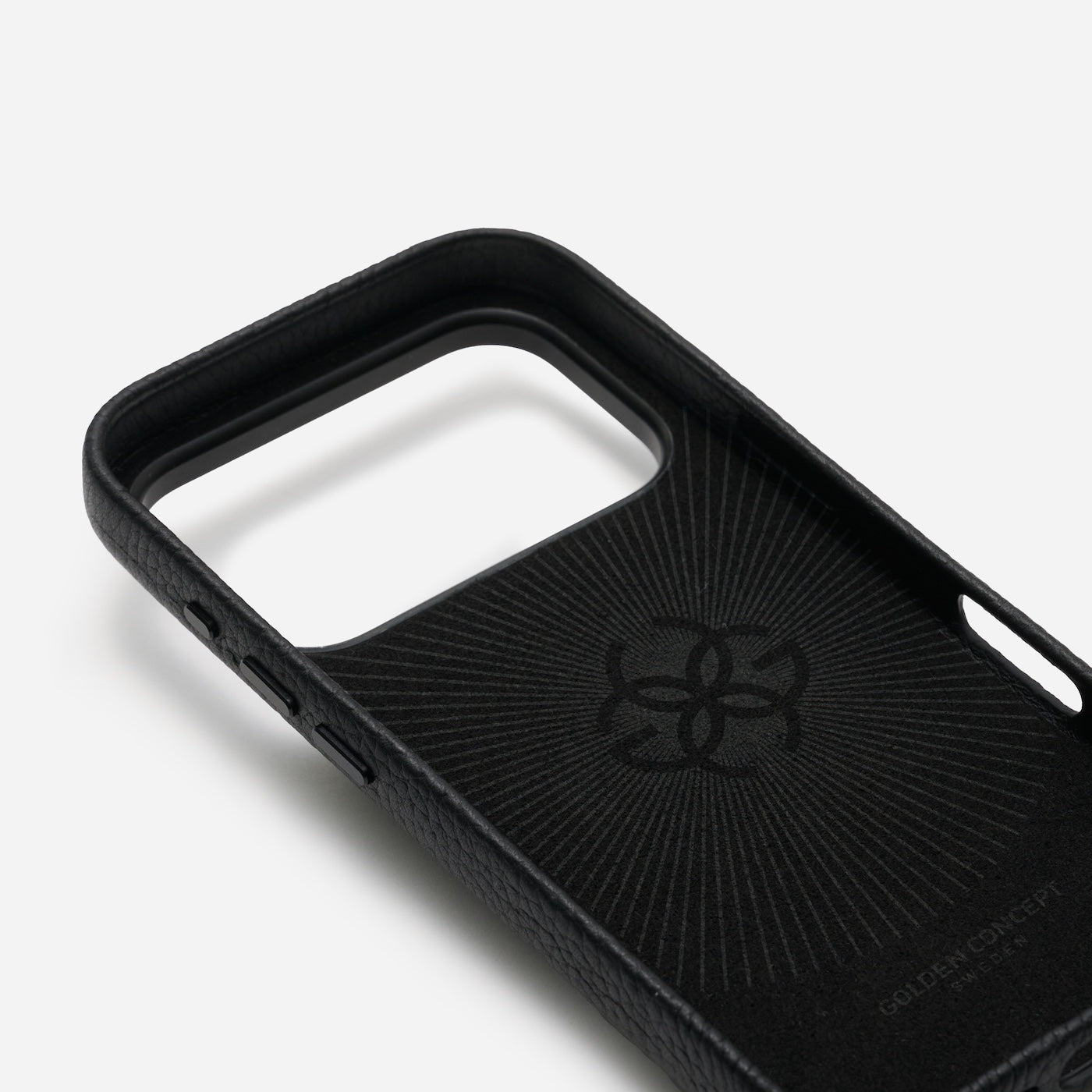 The interior is lined with soft microfiber, providing a gentle finish against the iPhone. A centered GC emblem sits within a radial pattern that highlights the MagSafe area.