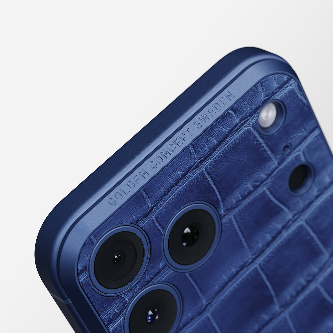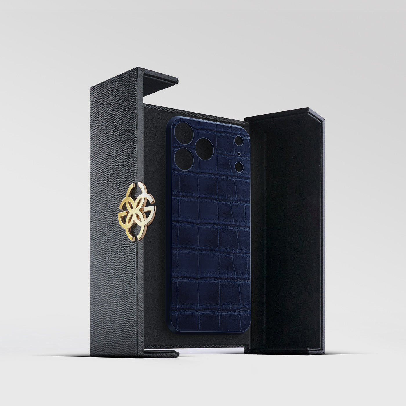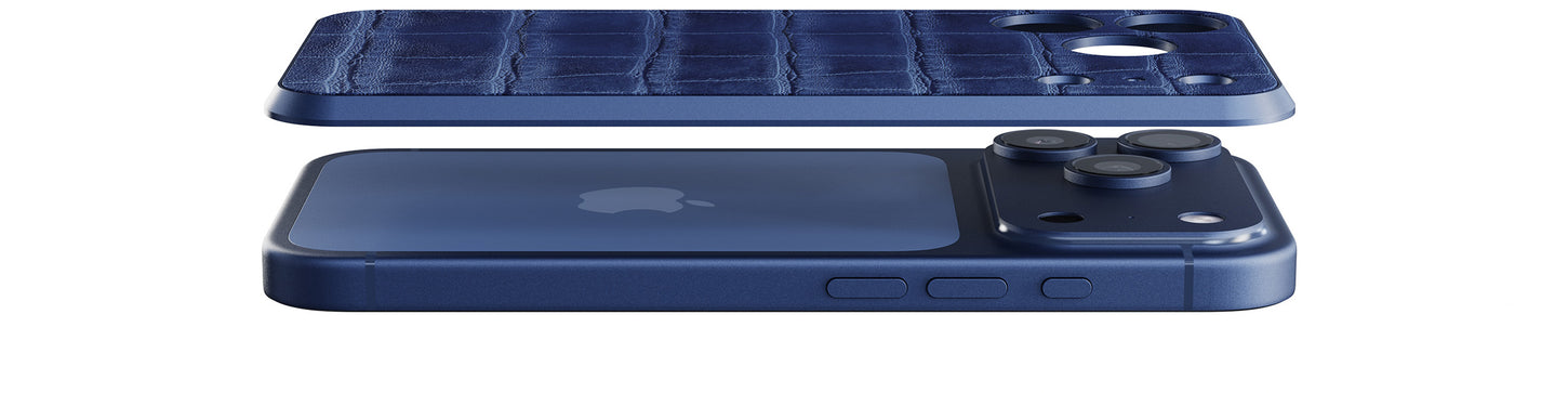 The color is carefully matched to Apple’s latest iPhone Pro Deep Blue finish, creating a sense of harmony between case and device. Defined by its embossed crocodile texture, the leather introduces depth and character while preserving the iPhone’s slim profile.