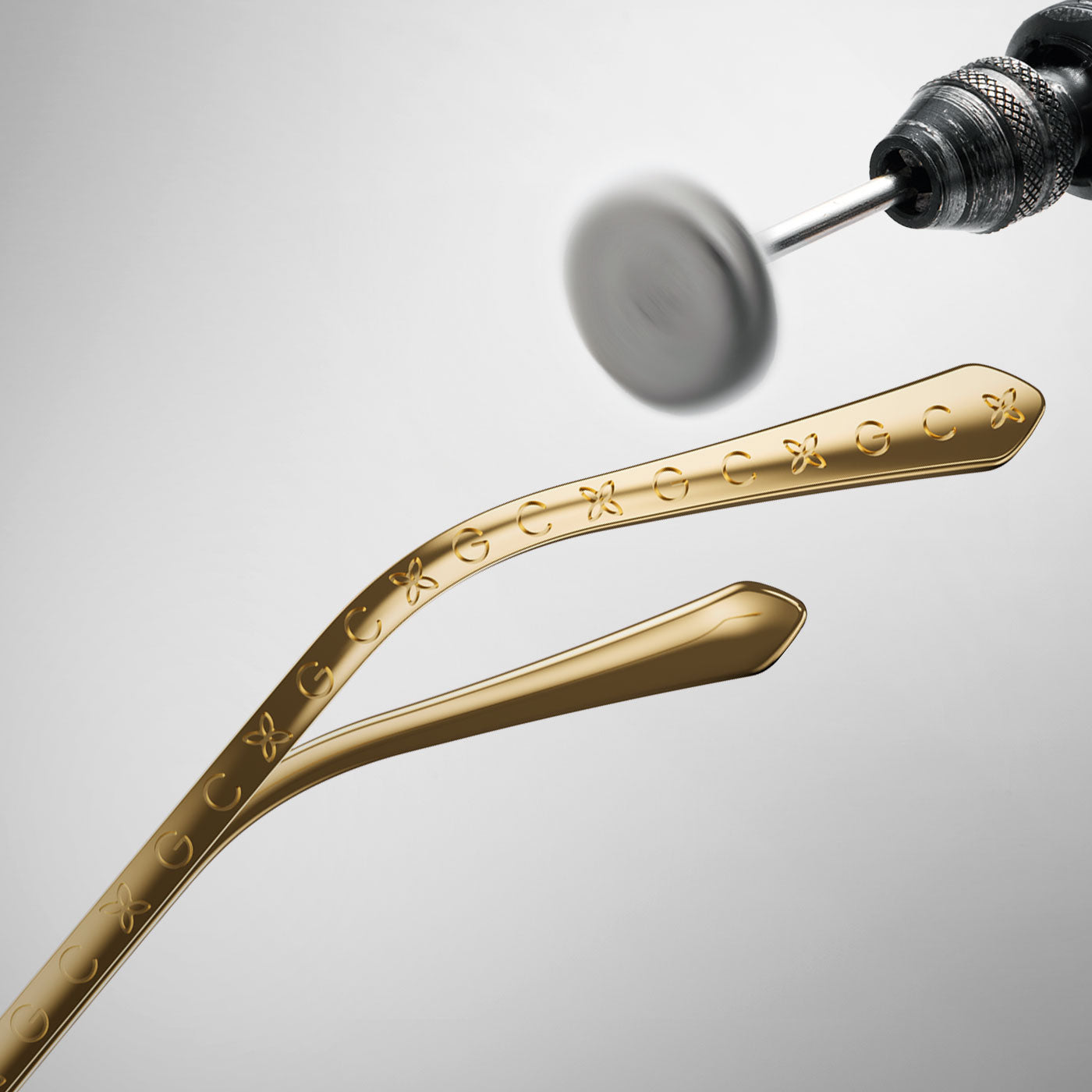 The sunglasses are crafted to be as exquisite as the finest precious jewelry. Utilizing the Guilloché technique, we create distinctive detailing on the bridge, temples and side shields, enhancing their uniqueness. The signature GC pattern flows seamlessly from the temple to the temple tip, enhancing the overall design. A GC logo adorns the end piece, making a subtle brand statement.