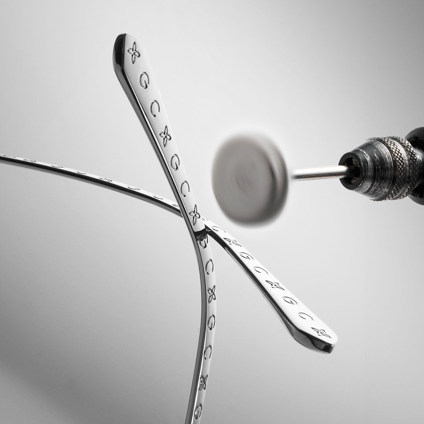 The sunglasses are crafted to be as exquisite as the finest precious jewelry. Utilizing the Guilloché technique, we create distinctive detailing on the bridge, temples and side shields, enhancing their uniqueness. The signature GC pattern flows seamlessly from the temple to the temple tip, enhancing the overall design. A GC logo adorns the end piece, making a subtle brand statement.