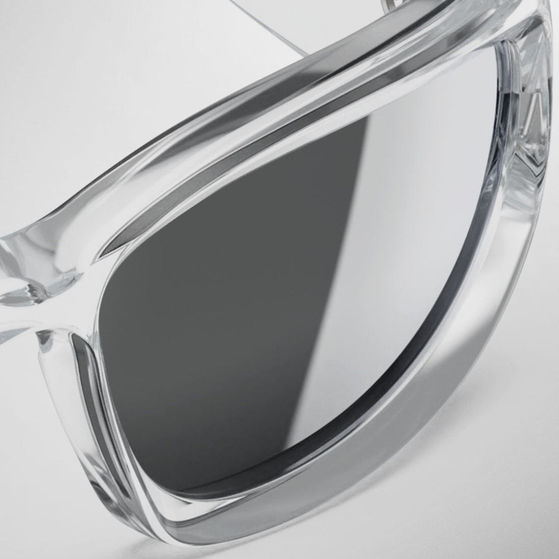 The Vision sunglasses feature a narrow cat-eye shape with a bold design, offering a striking and confident look. With a clear frame and mirrored silver lenses, they enhance the overall design, making a unique statement. Their unisex style guarantees versatility for any outfit. The Vision sunglasses embody a harmonious blend of bold details and smooth facets, elevating their modern elegance.